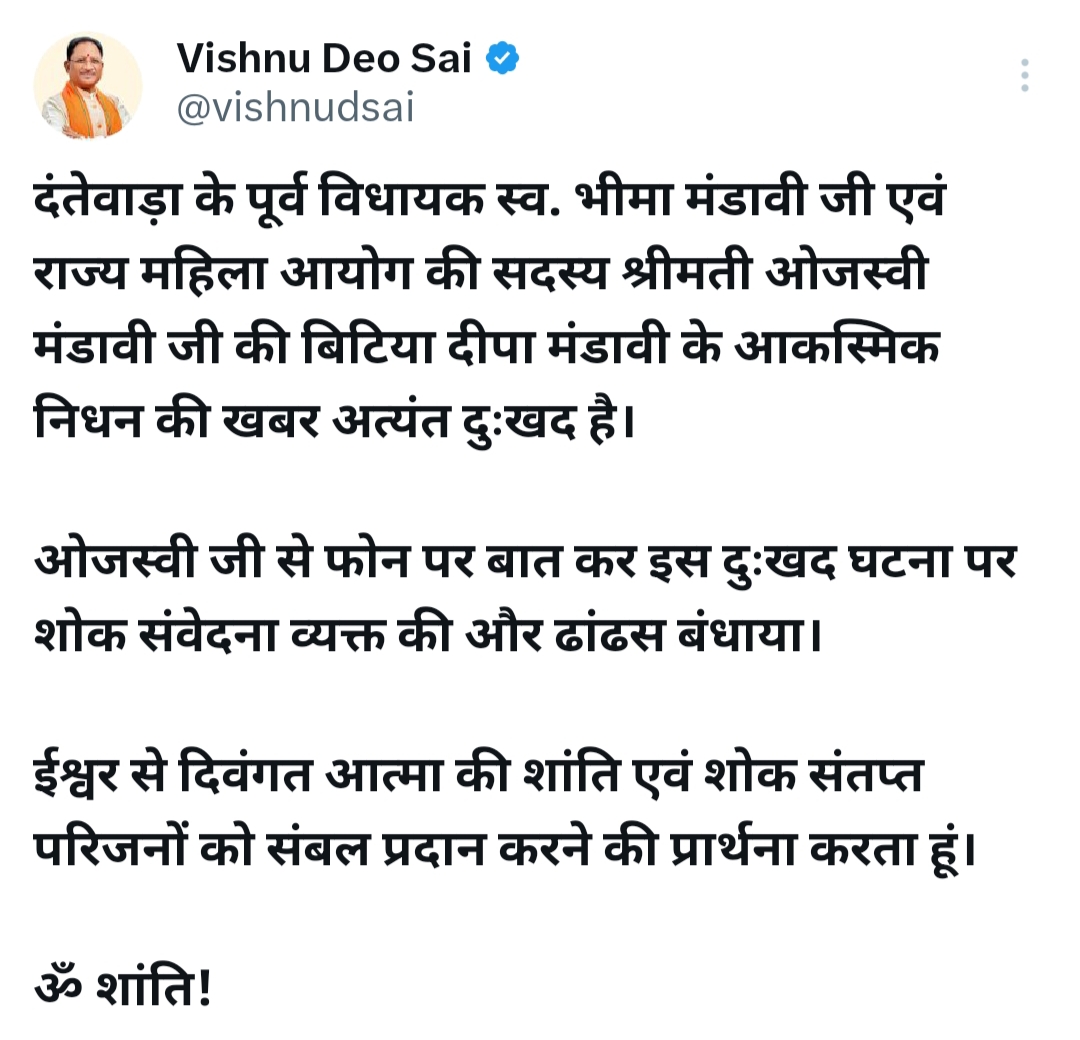 दीपा मंडावी के निधन पर छत्तीसगढ़ के मुख्यमंत्री विष्णुदेव साय ने गहरा दुख प्रकट किया। उन्होंने अपने एक्स अकाउंट पर लिखा कि दंतेवाड़ा के दिवंगत पूर्व विधायक भीमा मंडावी और राज्य महिला आयोग की सदस्य ओजस्वी मंडावी की बिटिया दीपा मंडावी के आकस्मिक निधन की खबर अत्यंत दुःखद है।