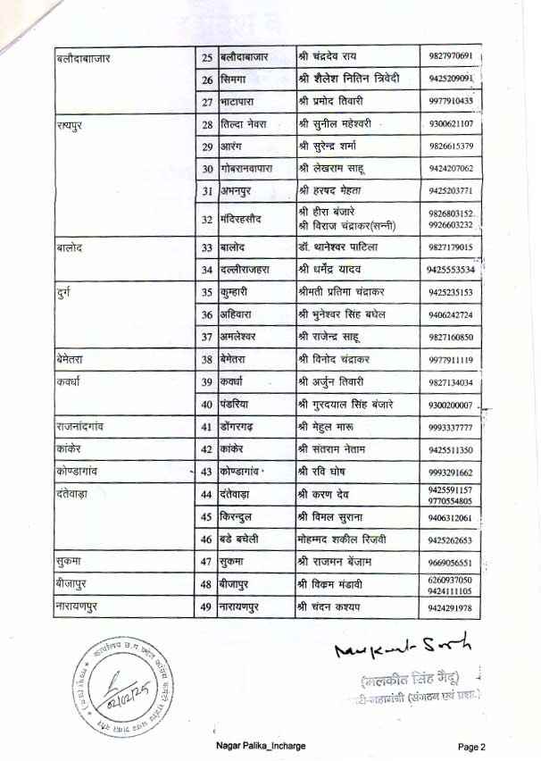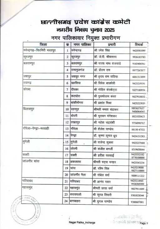 रायपुर। छत्तीसगढ़ में होने वाले नगरीय निकाय चुनाव 2025 के लिए कांग्रेस ने चुनाव प्रभारियों की नियुक्ति कर दी है। प्रदेश कांग्रेस अध्यक्ष दीपक बैज ने 49 नगर पालिकाओं के लिए प्रभारियों की सूची जारी की है, जिसमें पार्टी के वरिष्ठ नेताओं के साथ-साथ सक्रिय कार्यकर्ताओं को भी जिम्मेदारी दी गई है।