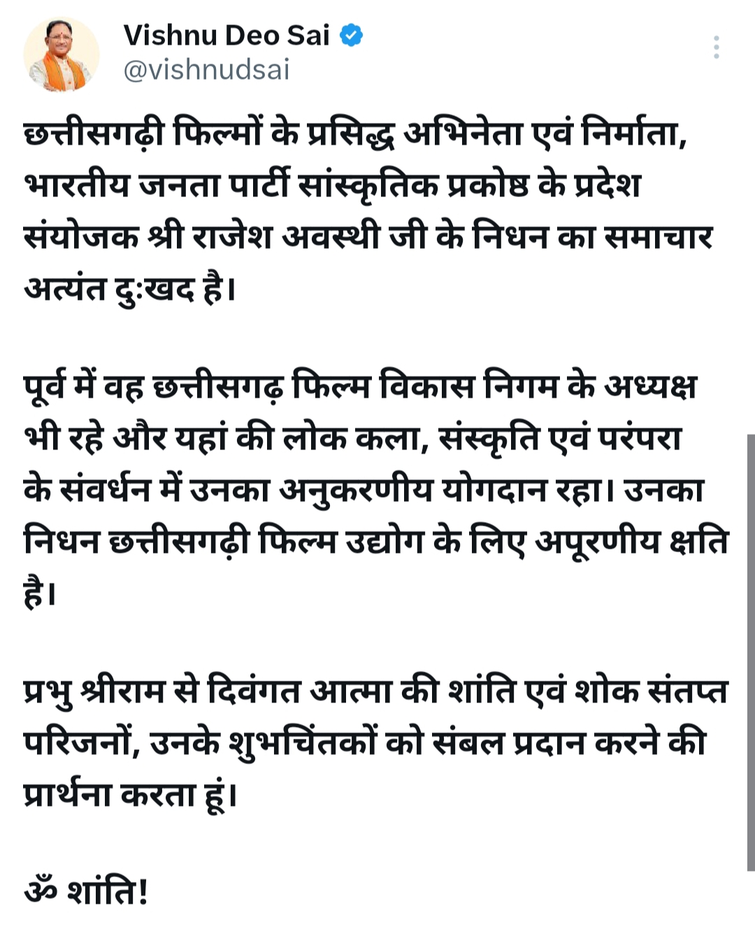 बता दें कि दिल का दौड़ा पड़ने से छालीवुड के जाने माने कलाकार और बीजेपी नेता राजेश अवस्थी का रविवार देर रात 11 बजे गरियाबंद में निधन हो गया. छत्तीसगढ़ी फिल्म कलाकार राजेश अवस्थी के निधन पर मुख्यमंत्री विष्णुदेव साय, मंत्री, विधायक और पार्टी के नेताओं ने शोक जताया है.