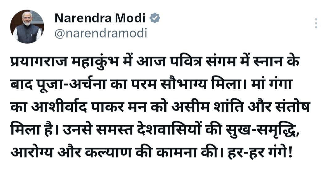 प्रधानमंत्री नरेंद्र मोदी बुधवार को प्रयागराज के महाकुंभ मेले में स्नान के बाद ट्वीट करके खुशी जताई। उन्होंने एक्स पर लिखा, “प्रयागराज महाकुंभ में आज पवित्र संगम में स्नान के बाद पूजा-अर्चना का परम सौभाग्य मिला। मां गंगा का आशीर्वाद पाकर मन को असीम शांति और संतोष मिला है। उनसे समस्त देशवासियों की सुख-समृद्धि, आरोग्य और कल्याण की कामना की। हर-हर गंगे!”
