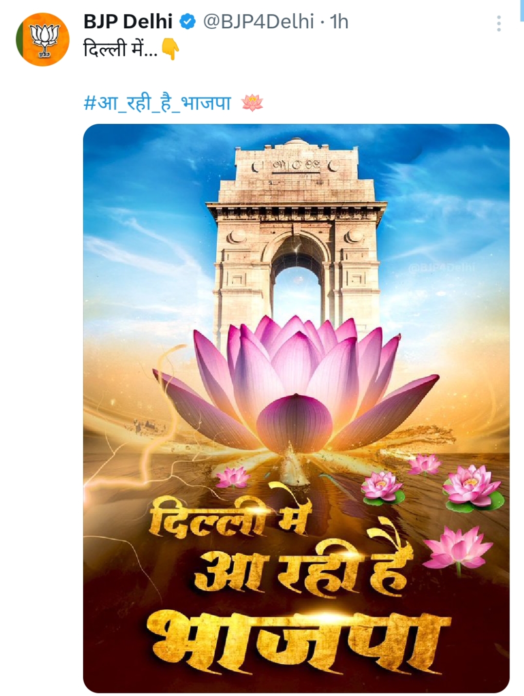 दिल्ली बीजेपी के एक्स हैंडल से जारी पोस्टर में लिखा है- ‘दिल्ली में…#आ_रही_है_भाजपा!’ इसके अलावा पोस्टर में लिखा है- ‘दिल्ली में आर रही भाजपा’। पोस्टर में दिल्ली की पहचान इंडिया गेट की तस्वीर है। इसके अलावा बीजेपी के चुनाव चिन्ह कमल के फूल की तस्वीर है।