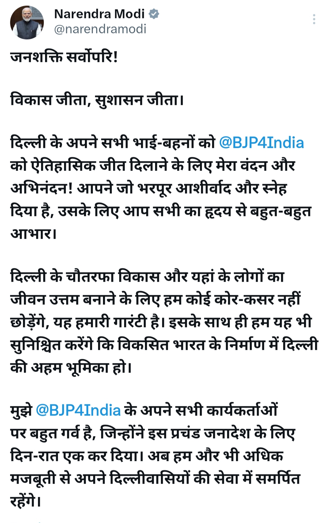 मोदी ने ‘एक्स’ पर एक पोस्ट में कहा, ‘‘दिल्ली के चौतरफा विकास और यहां के लोगों का जीवन उत्तम बनाने के लिए हम कोई कोर-कसर नहीं छोड़ेंगे, यह हमारी गारंटी है। इसके साथ ही हम यह भी सुनिश्चित करेंगे कि विकसित भारत के निर्माण में दिल्ली की अहम भूमिका हो।’’ उन्होंने कहा, ‘‘जनशक्ति सर्वोपरि! विकास जीता, सुशासन जीता। दिल्ली के अपने सभी भाई-बहनों को भाजपा को ऐतिहासिक जीत दिलाने के लिए मेरा वंदन और अभिनंदन! आपने जो भरपूर आशीर्वाद और स्नेह दिया है, उसके लिए आप सभी का हृदय से बहुत-बहुत आभार।’’