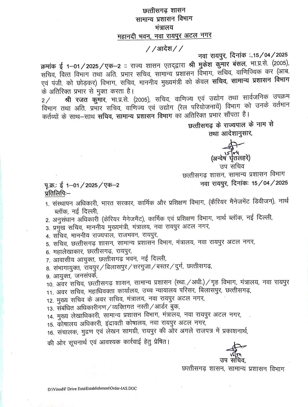आदेश भी स्पष्ट किया गया है कि मुकेश बंसल के पास वित्त विभाग के सचिव, सामान्य वाणिज्य कर आबकारी विभाग के सचिव और मुख्यमंत्री के सचिव की जिम्मेदारी पहले की तरह रहेगी । रजत कुमार के पास वाणिज्य एवं उद्योग तथा सार्वजनिक उपक्रम विभाग के सचिव और वाणिज्य एवं उद्योग रेल परियोजना विभाग के सचिव का अतिरिक्त प्रभार है, वह वर्तमान कर्तव्यों के साथ-साथ सामान्य प्रशासन विभाग के सचिव का अतिरिक्त प्रभार भी संभालेंगे।