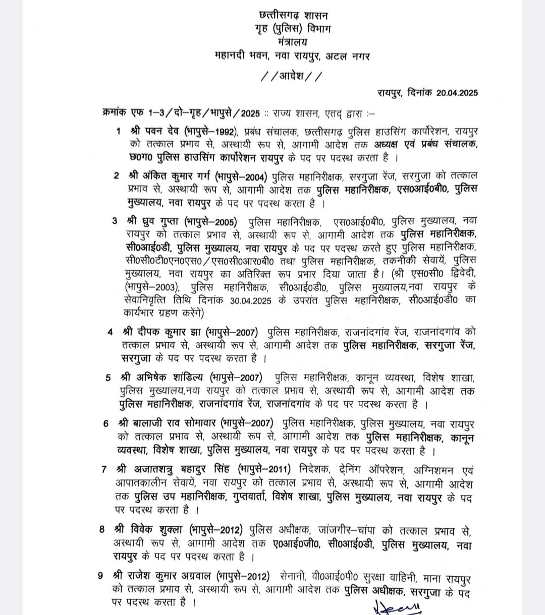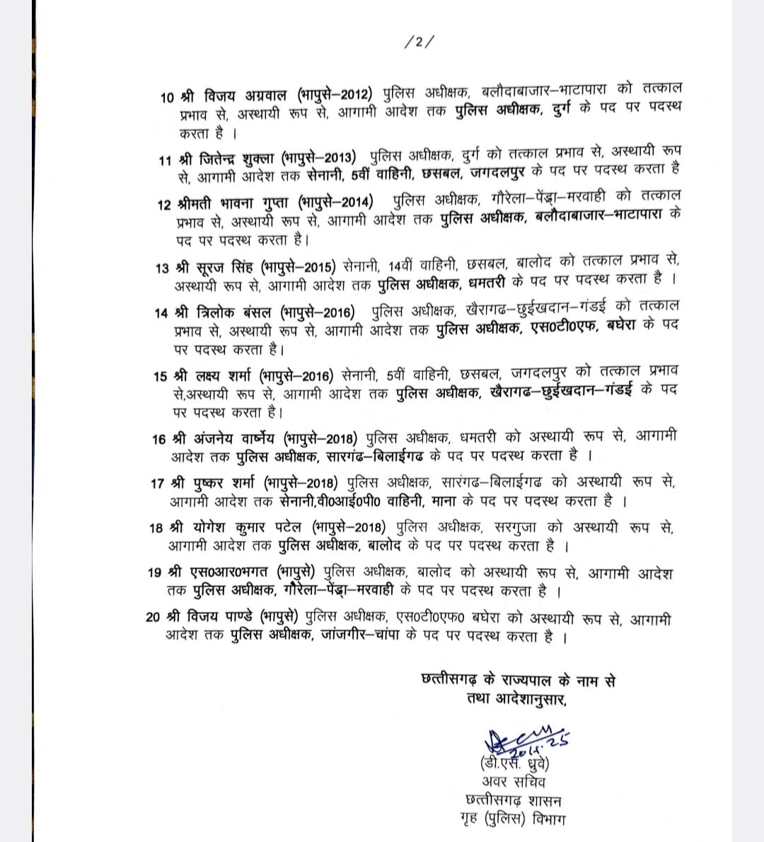रायपुर: छत्तीसगढ़ सरकार आईपीएस अधिकारियों का ट्रांसफर कर दिया है। 20 अधिकारियों की लिस्ट जारी की गई है जिनमें कुछ जिलों के एसपी भी बदल दिए गए हैं।