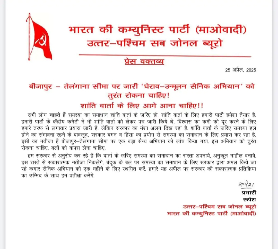 बीजापुर-तेलंगाना सीमा पर नक्सलियों के खिलाफ देश का सबसे बड़ा ऑपरेशन जारी है. इस बीच नक्सलियों ने जारी ऑपरेशन को तत्काल रोकने की अपील है. इसके लिए नक्सलियों के नक्सलियों की उत्तर पश्चिम बस्तर ब्यूरो के प्रभारी रूपेश ने प्रेस नोट जारी किया है. बीजापुर-तेलंगाना सीमा पर जारी बड़ा सैन्य अभियान को तुरंत रोकने को कहा है.