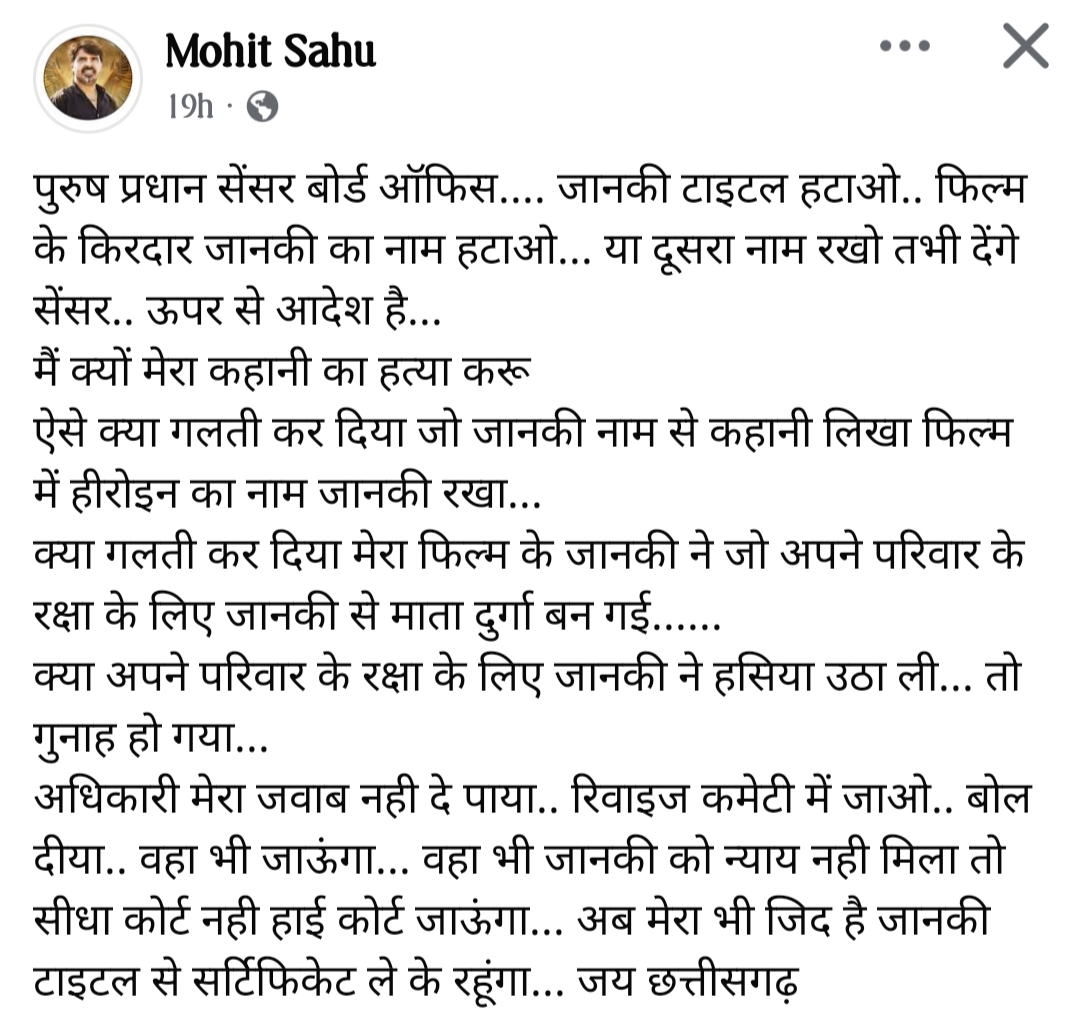 रायपुर। छत्तीसगढ़ के फ़िल्म प्रोड्यूसर मोहित साहू की हिन्दी फ़िल्म ‘जानकी’ को मुम्बई स्थित सेंसर बोर्ड के दफ़्तर ने ‘जानकी’ नाम पर आपत्ति जताते हुए प्रदर्शन के लिए सर्टिफेकेट देने से इंकार कर दिया। मोहित साहू इस समय मुम्बई में ही हैं। उन्होंने कहा कि आगे रिवाइजिंग कमेटी में जायेंगे। वहां बात नहीं सुनी गई तो हाईकोर्ट का दरवाज़ा खटखटाएंगे। ‘जानकी’ की कहानी मोहित साहू की ही लिखी हुई है।