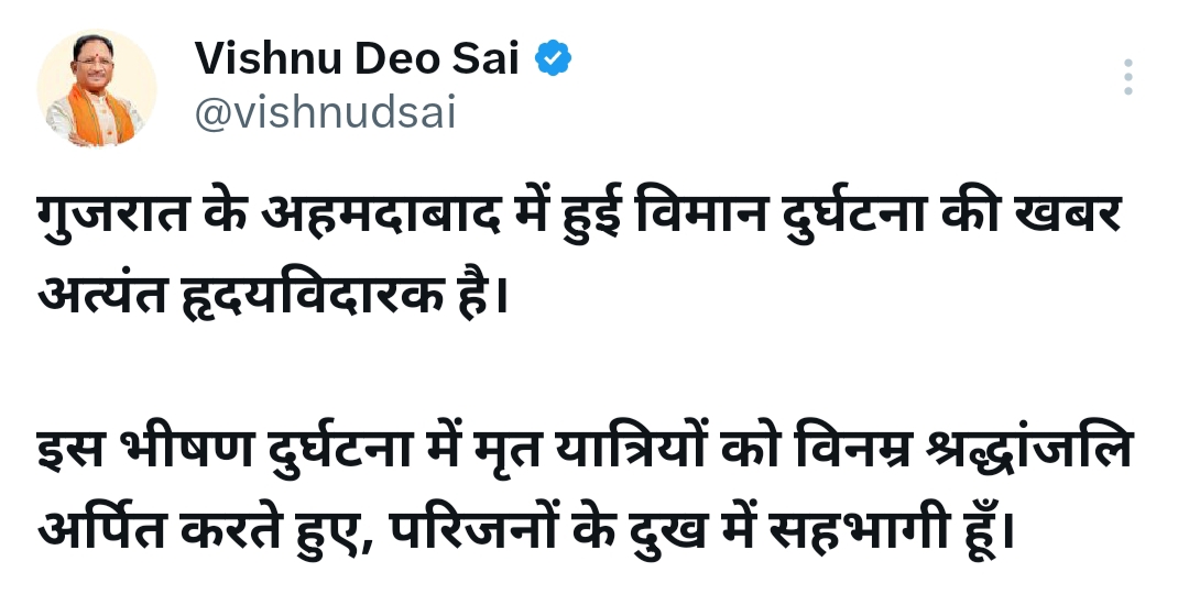 रायपुर: छत्तीसगढ़ के सीएम विष्णुदेव साय ने गुजरात के अहमदाबाद में हुई विमान दुर्घटना को अत्यंत हृदयविदारक और दुखद घटना बताया है। उन्होंने इस भीषण दुर्घटना में मृत यात्रियों के प्रति गहरी संवेदना व्यक्त करते हुए उन्हें विनम्र श्रद्धांजलि अर्पित की है।